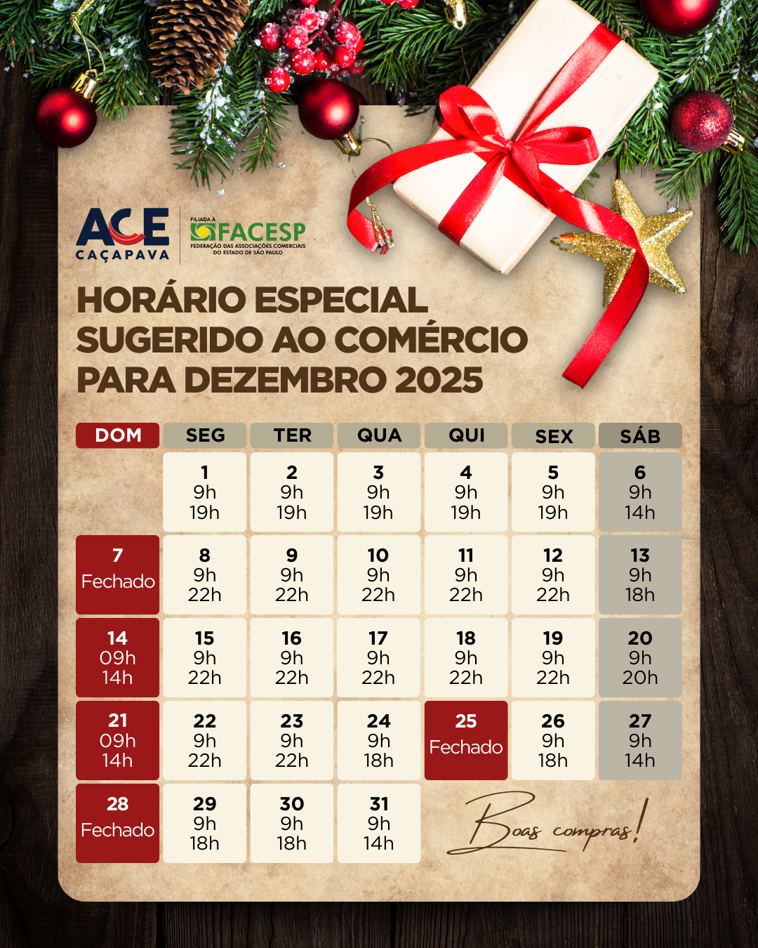 A ACE Caçapava divulgou o horário especial sugerido ao comércio para o mês de dezembro de 2025 — período em que o movimento nas lojas cresce e os consumidores buscam mais comodidade para realizar suas compras de fim de ano. Para a construção dessa proposta, a ACE consultou as empresas do comércio central, alinhando o horário sugerido às demandas reais dos empresários e à tradição do calendário natalino.